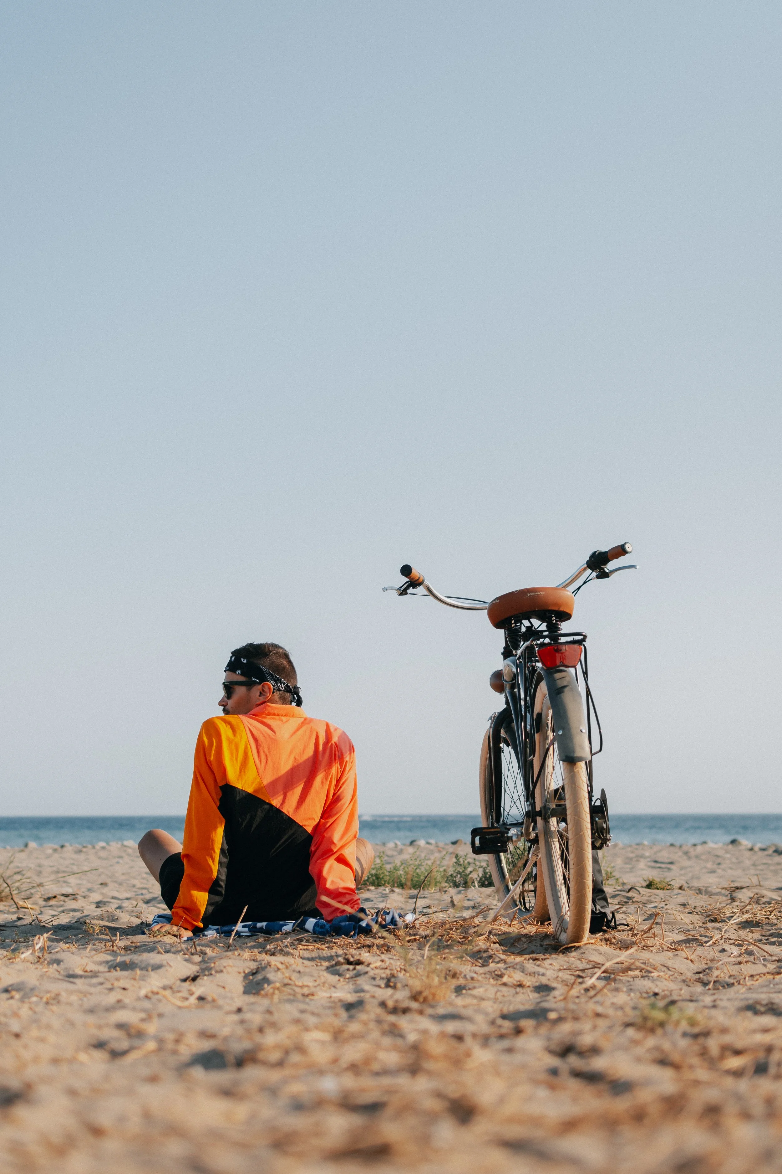Person sitting on a beach beside a bicycle, wearing an orange and black jacket, looking towards the ocean.