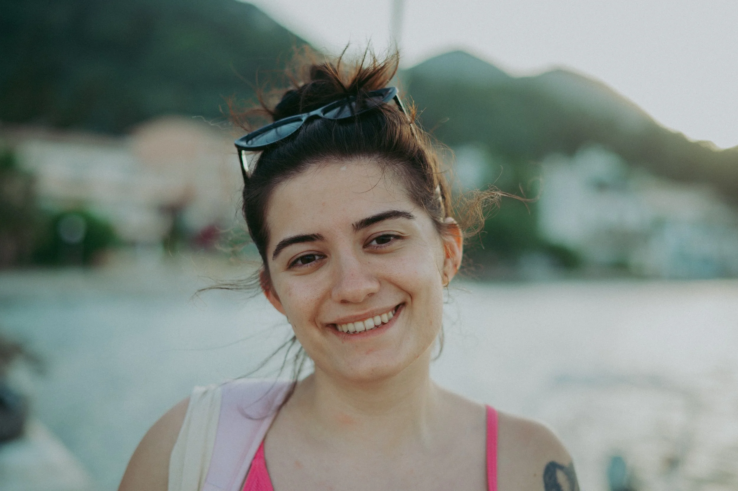 Smiling woman with sunglasses on her head, standing outdoors with blurred background of water and hills.