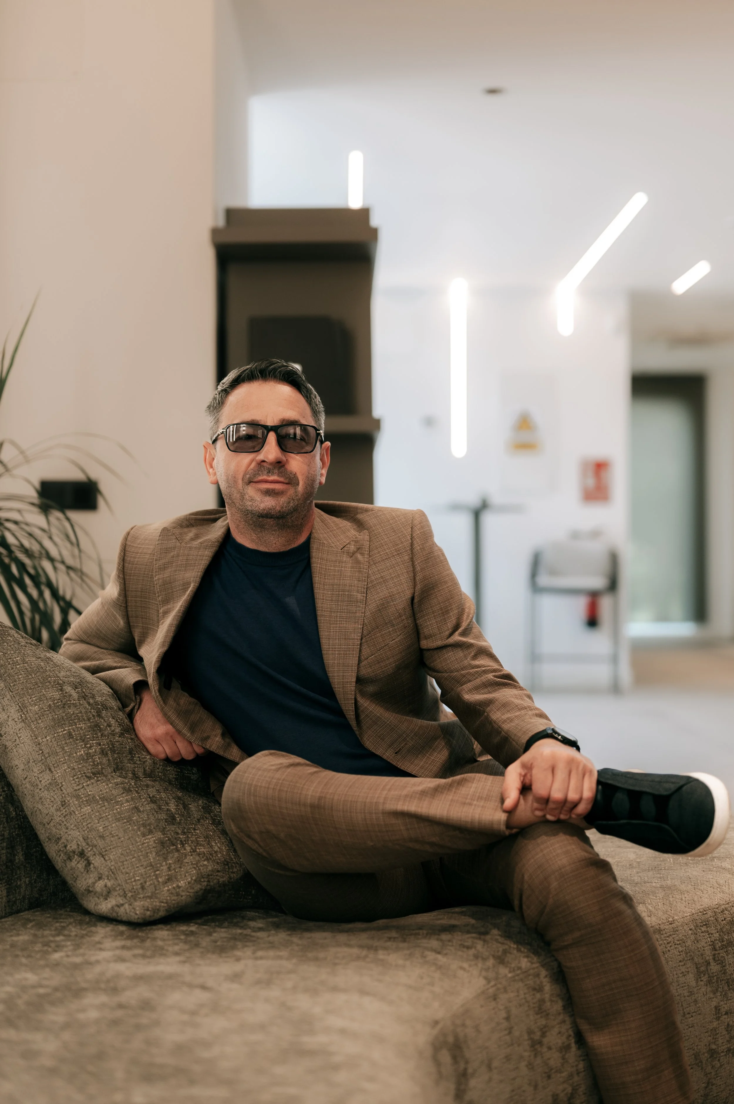 A man in a brown plaid suit, sunglasses, and a navy shirt sitting on a sofa in a modern indoor setting with white walls and decorative lighting.