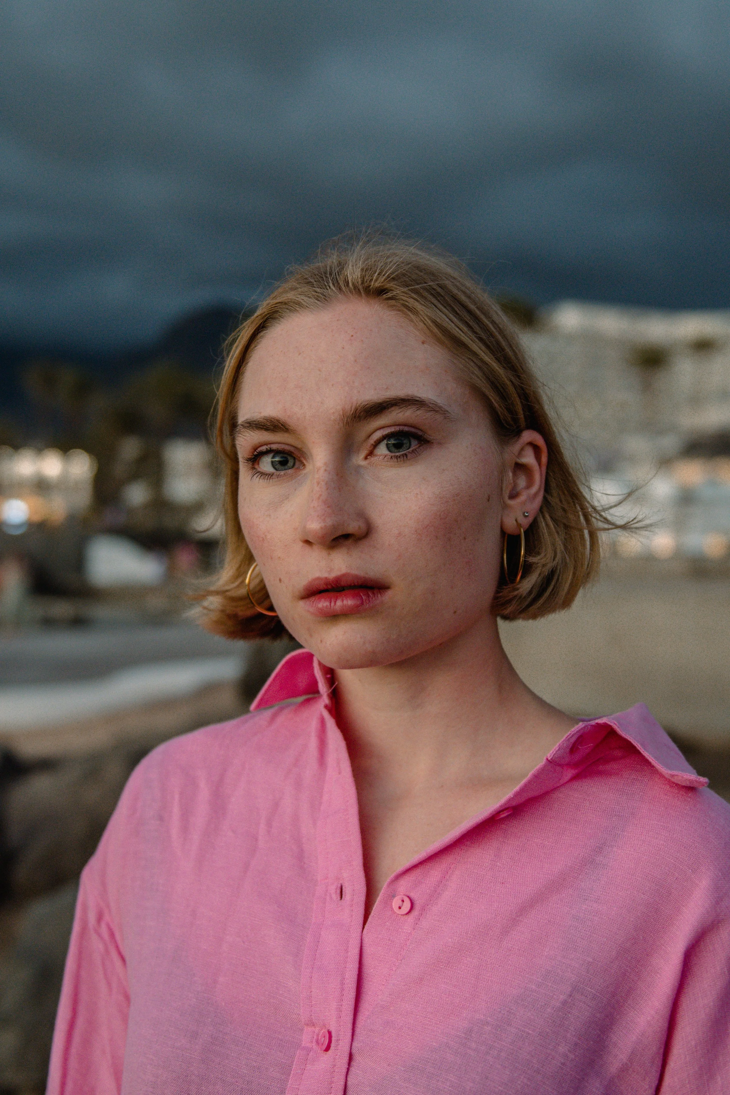 Person in pink shirt with short blonde hair outdoors with a cloudy sky background.