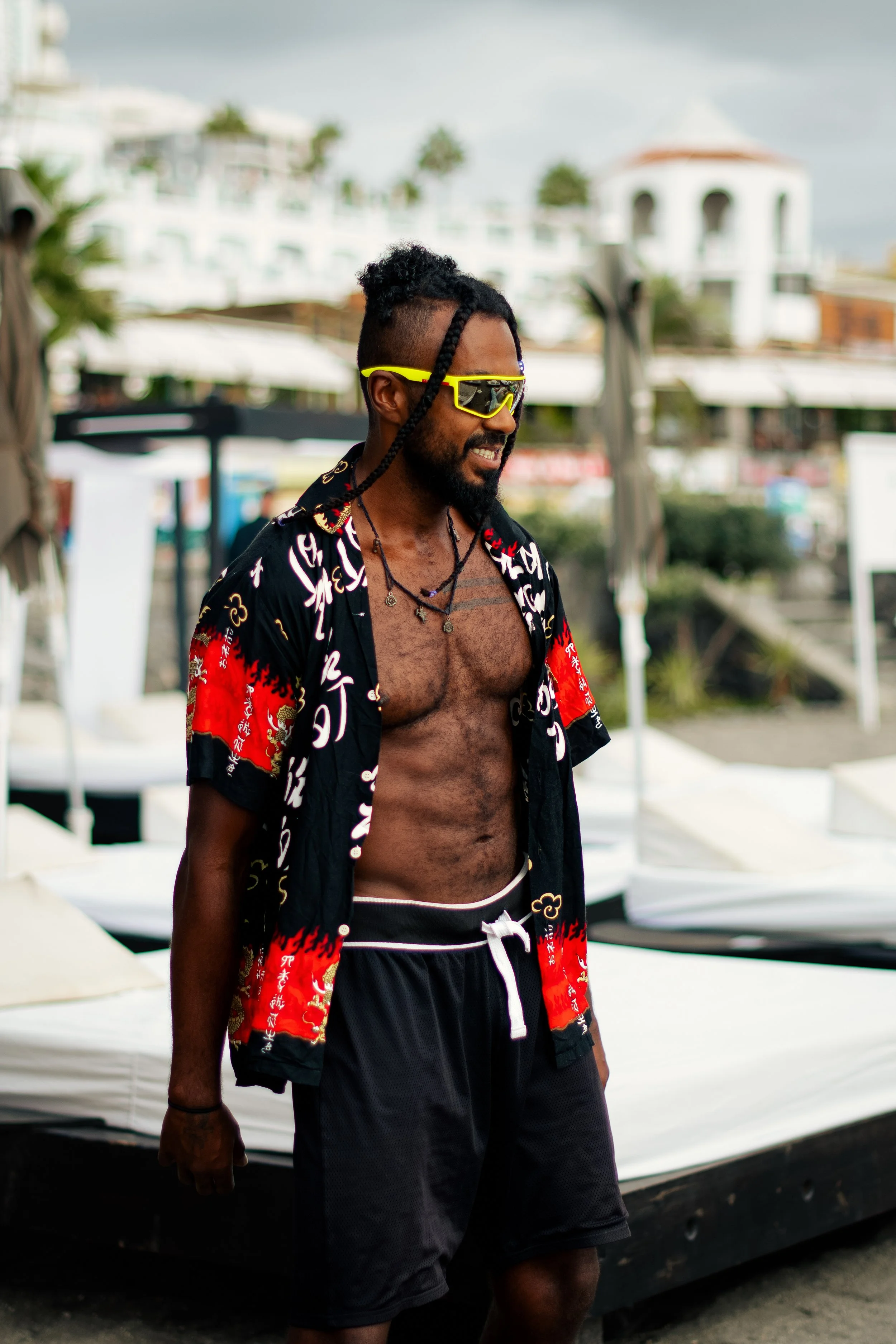 Man wearing sunglasses, an open shirt with a colorful pattern, and black shorts, standing outdoors on a beach or resort setting.