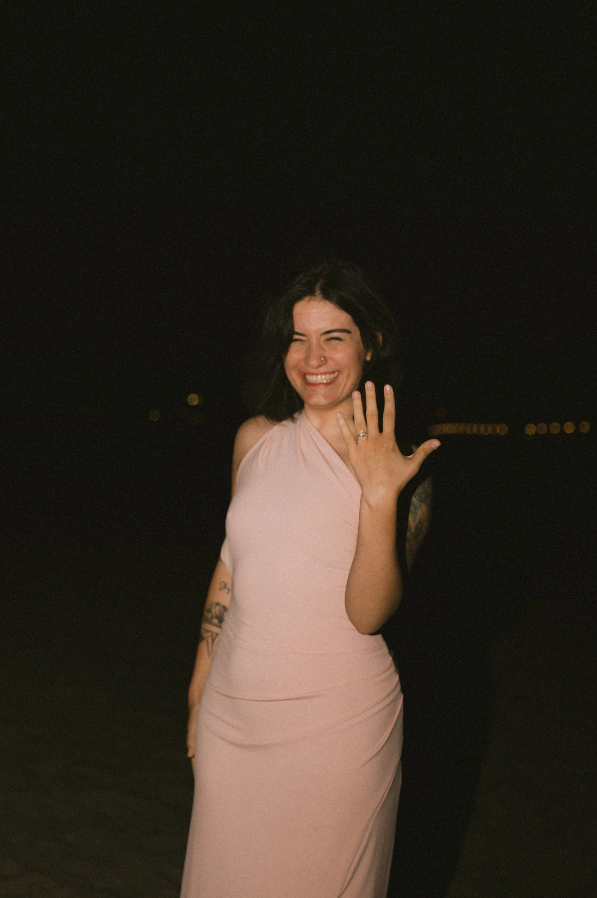 A woman with dark hair and a tattoo of a dog's face on her upper arm, wearing a light pink dress with a red flower in her hair, standing near a beach with water and bushes in the background during sunset.