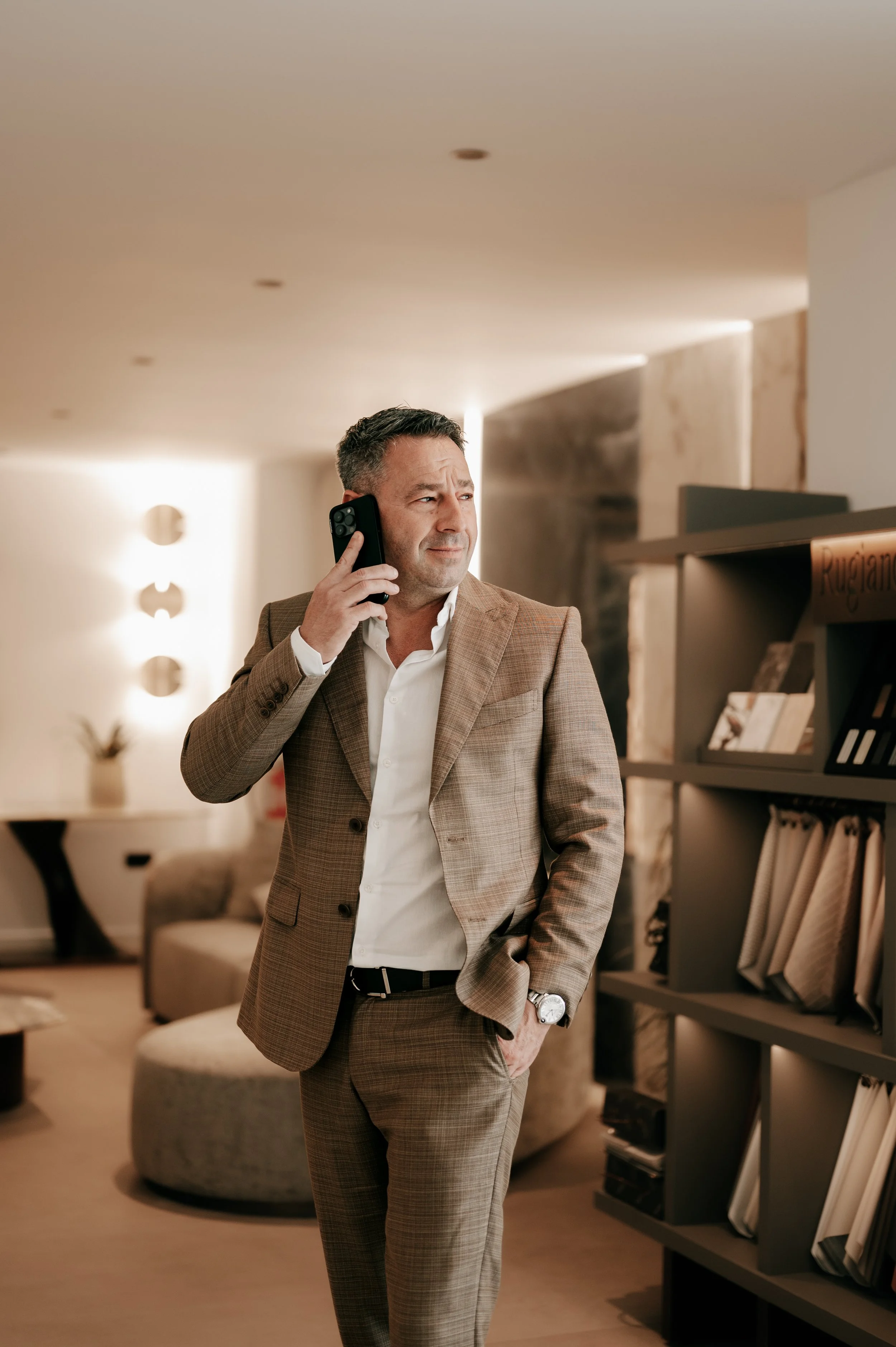 A man in a brown checked suit is talking on his cellphone indoors, standing in a modern, well-lit room with bookshelves and contemporary furniture.